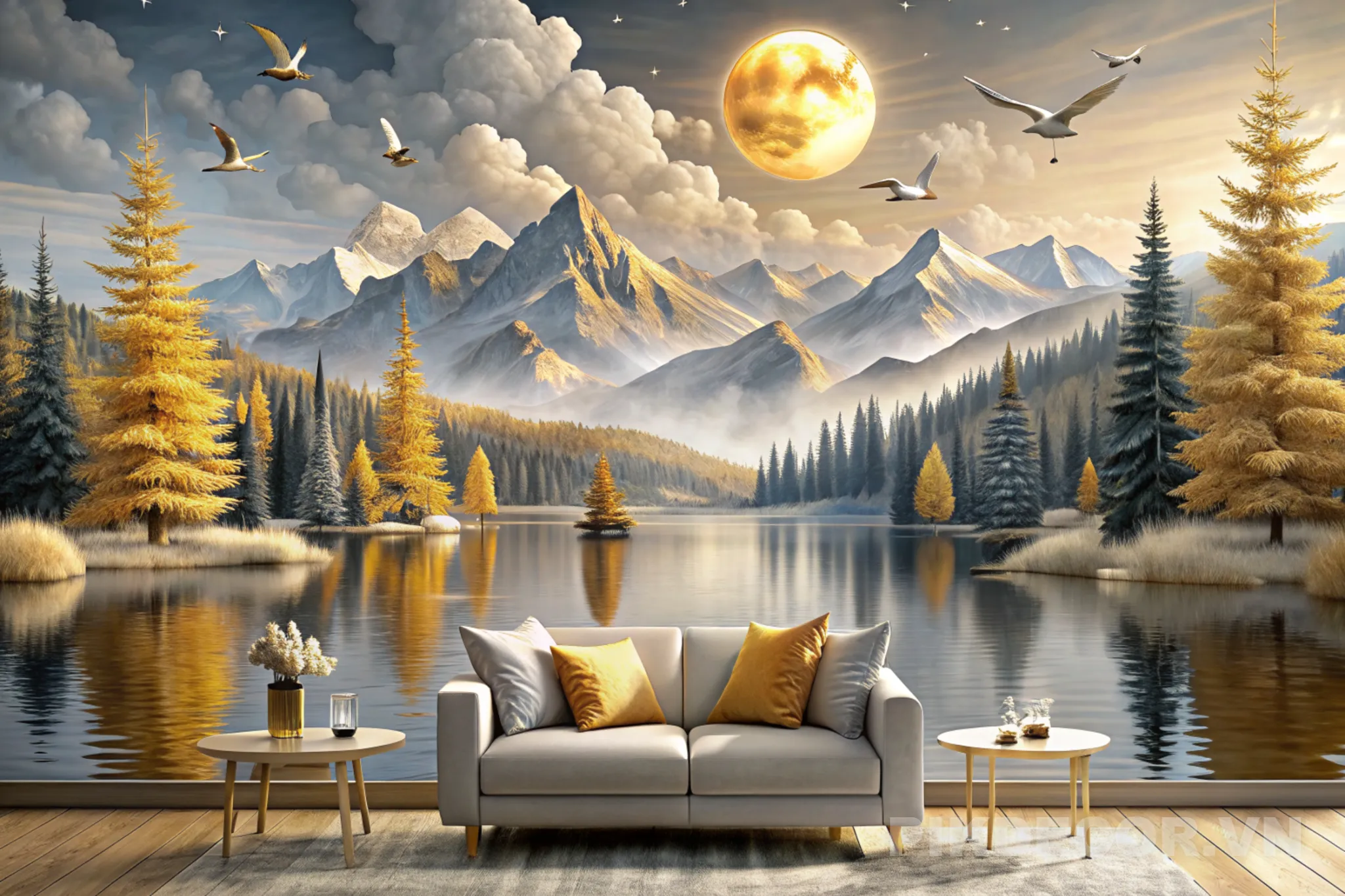 3d-modern-canvas-art-mural-wallpaper-landscape-lake-background-moon-water-golden-christmas-tree-gray-mountain-sun-with-clouds-golden-birds