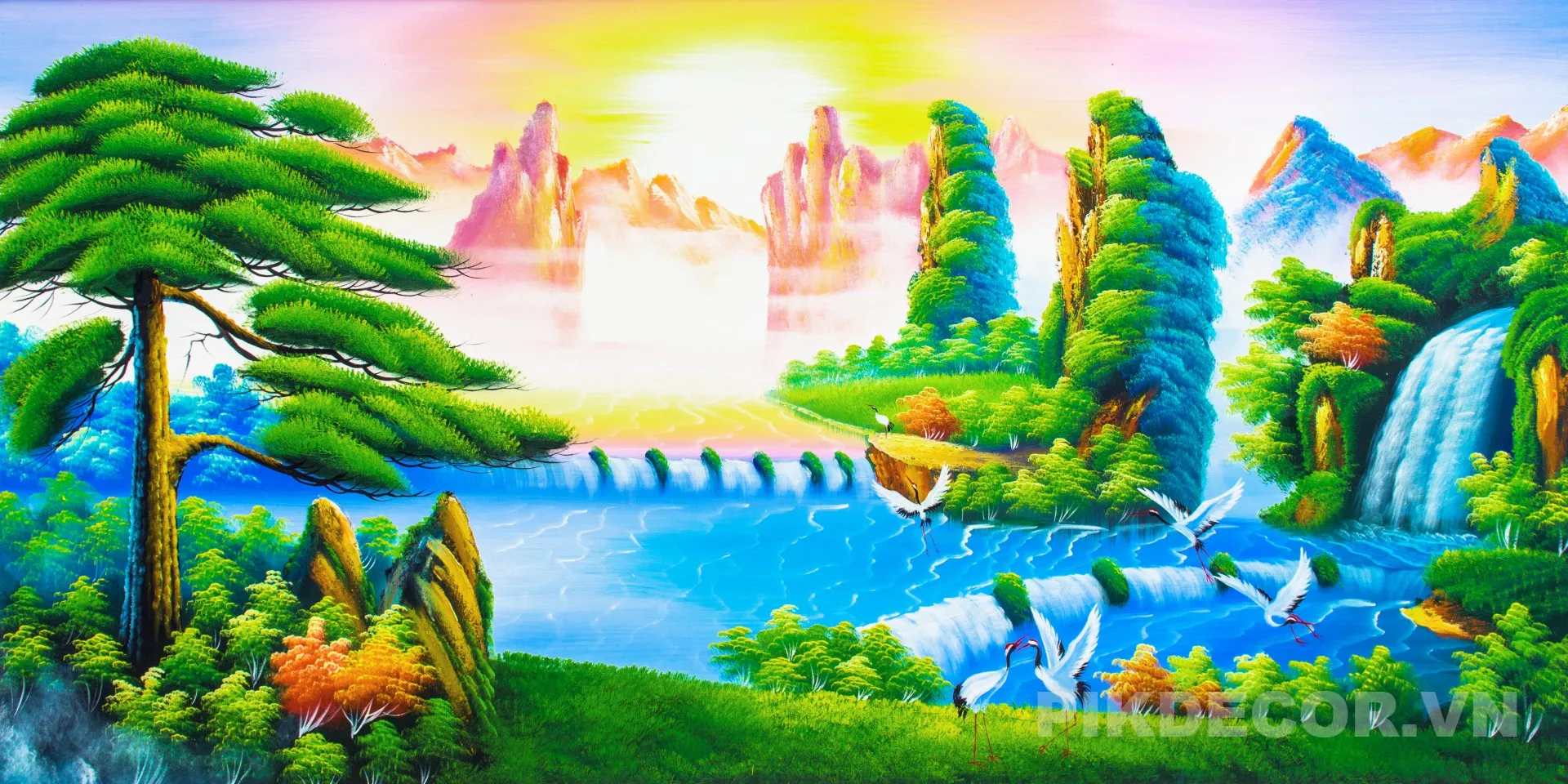 Mẫu Tranh Dán Tường 3D Sơn Thủy Hữu Tình Thác Nước Chim Hạc Phong Thủy Cực Đẹp Hút Tài Lộc